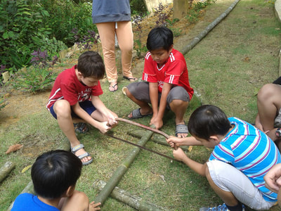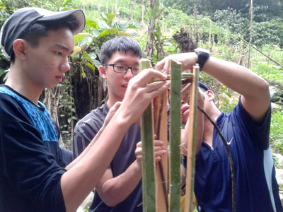 - Making fire from scratch with the aid of tree resin and dry bamboo,