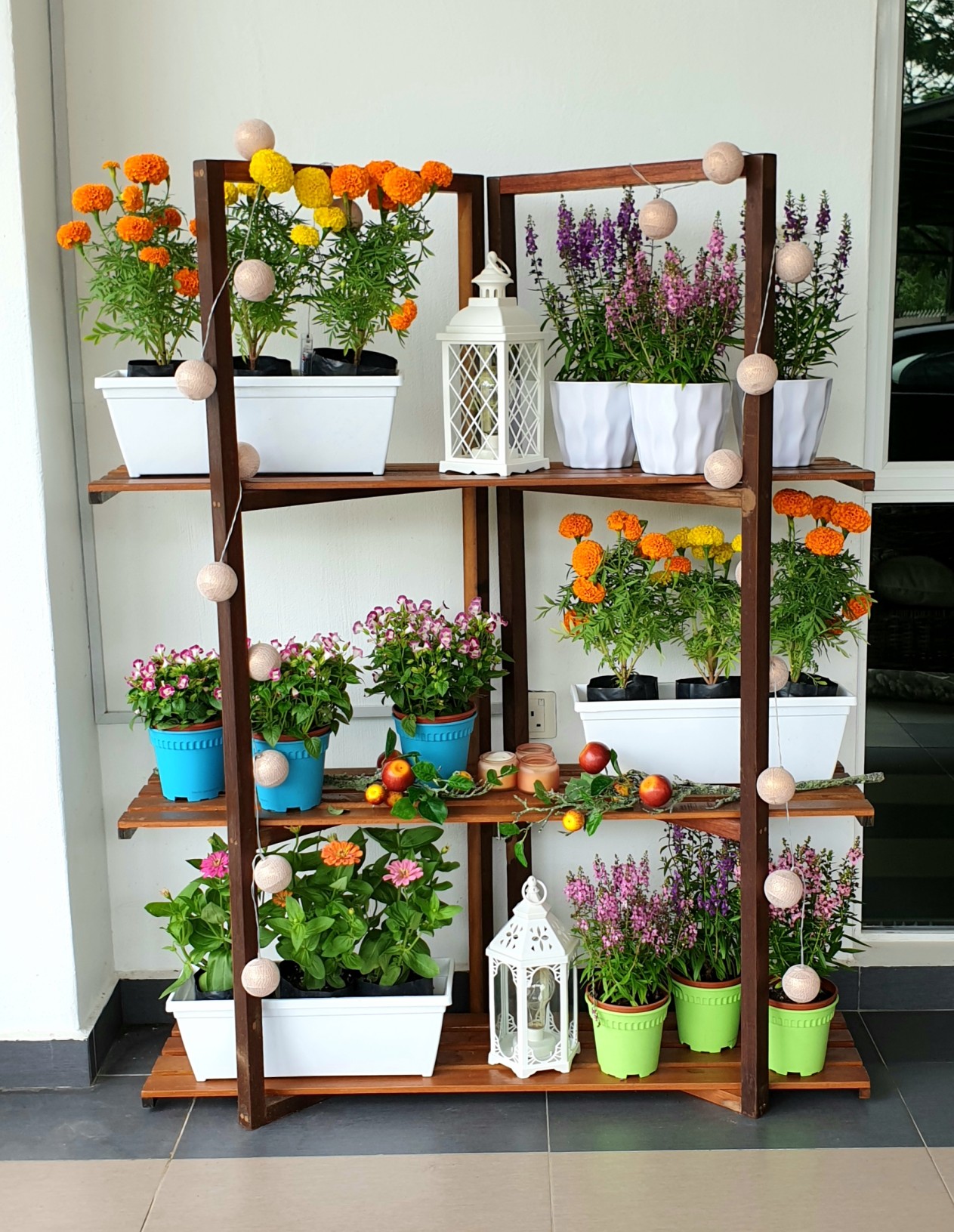 • 2 white lantern with batteries, 2 bubble LED fairy lights, 2 Scented candles in pots, 1 ornamental fruit branch, 3 rectangular planters, 6 round coloured pots, 3 textured white pots.